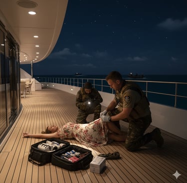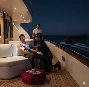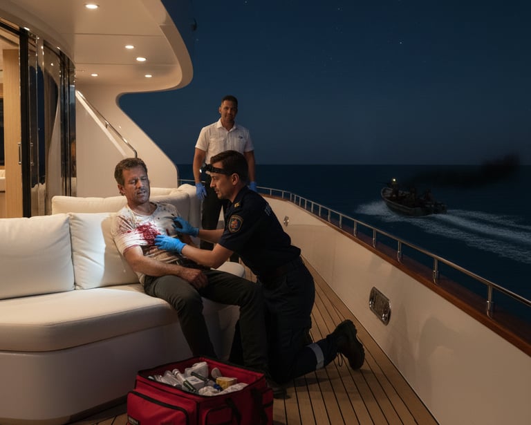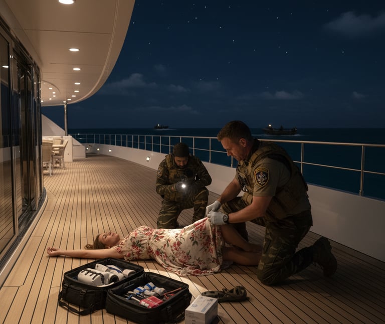 Recent data further amplifies the urgency: maritime piracy surged by over 50% globally in the first half of 2025 compared to 2024, with rising incidents in Latin America and the Caribbean posing direct threats to private yachts through violent boardings and theft. Imagine a piracy encounter or sudden injury—perhaps a fall overboard, a machinery mishap, or a gunshot wound amid an intrusion—transformed from chaos to control: our SOF-honed experts initiate rapid hemorrhage control using tourniquets and clotting agents to stop life-threatening bleeding in seconds; secure airway stabilization with advanced techniques like cricothyroidotomy if needed to prevent suffocation; and coordinate seamless evacuation via integrated drone surveillance or secure communications, all while providing pain management and monitoring vital signs to keep the victim stable until professional transport arrives. This level of response, backed by experience treating over 1,200 combat casualties and 60 chemical exposures, doesn't just save lives—it restores order, minimizes long-term complications, and protects your reputation and assets from the fallout of a tragedy.